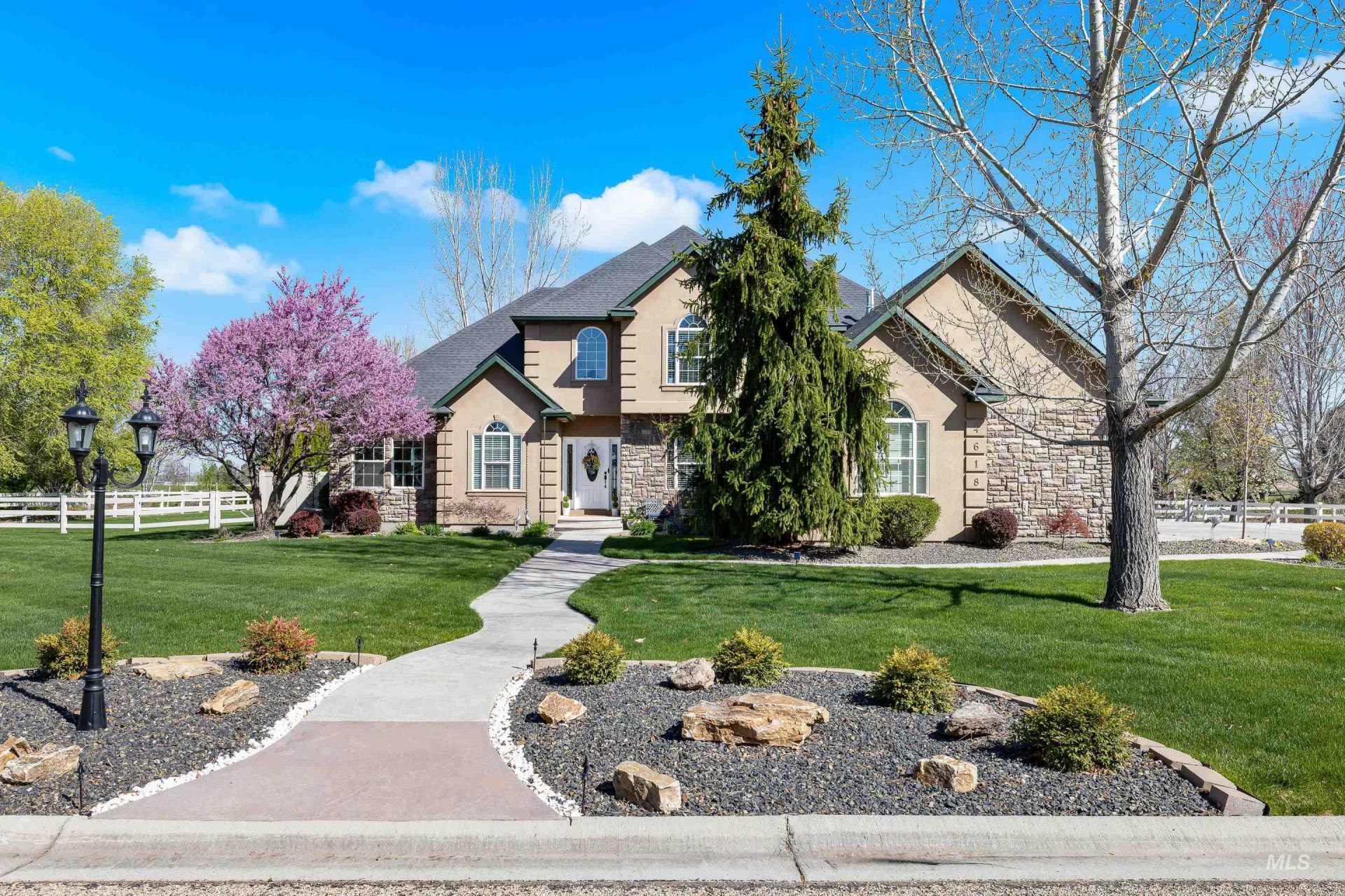 Stunning, must-see estate home on a 1-acre lot in Ada County with fabulous views of the foothills and no backyard neighbors. Main level primary suite features a fireplace, sitting area and private access to backyard patio. Primary bath features walk-in shower, soaker tub and quartzite counter tops. Kitchen features travertine tile floors, granite countertops, stainless appliances and granite island with seating option. Living room features a two-sided fireplace with dining area. Bonus room on second floor with bar/kitchen area and stunning views. Bedrooms two & three feature walk-in closets and a Jack-and-Jill bathroom. Fourth bedroom features an ensuite with shower and large walk-in closet. 34x34 detached insulated shop with unfinished bonus space above. Set in a community with 27 homes and 25 acres of common area including 1.4 miles of private walking paths.