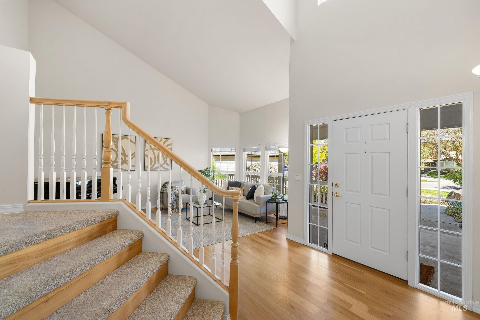 Tucked against the basalt cliffs of Surprise Valley and bordered by lush common area, BLM land, and direct trail access, this is a rare blend of natural beauty and everyday practicality. The irrigated, park-like backyard feels like a private retreat, with winding paths, a cascading waterfall, fire pit, raised garden beds, multiple patios, and fenced yard space with direct access from an exceptional mudroom w/custom in-cabinet pet door. Inside, the floorplan is as functional as it is beautiful, with hardwood flooring, a soaring two-story great room, and a remodeled kitchen featuring granite countertops, Jenn-Air gas cooktop, and multiple dining areas. Upstairs, the owners suite includes a private view deck, spa-like bath, and oversized walk-in closet loaded with custom cabinetry and storage. Bonus flex space/mudroom on main level with sink, counters, cabinetry, and storage supports hobbies, study, or projects plus direct access to fenced yard. Roof new in 2022, HVAC 2019 with whole house humidifier and air purifier.