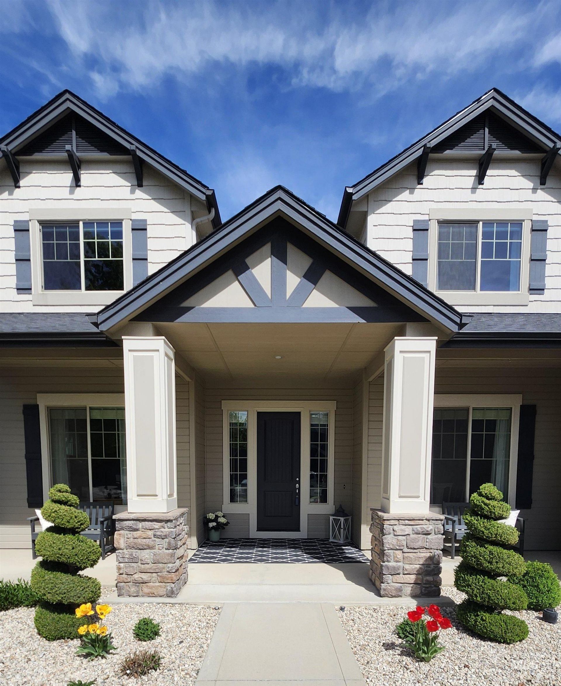 Experience refined living in Meridians sought-after Paramount community, perfectly positioned on a peaceful lane. This stunning, impeccably maintained residence welcomes you with a grand two-story entry and a striking custom staircase with elegant tile accents. Light-filled and expansive, the home showcases extensive gleaming hardwood floors and thoughtfully designed spaces throughout. The main level features a great room and a chefs kitchen appointed with granite countertops and a gas cooktop. The luxurious primary suite offers a shiplap accent wall, private access to the covered patio, a spa-inspired bath with tiled soaking tub and shower, and a generous walk-in closet. An office or fifth bedroom, along with a formal dining or flex space, completes the main floor. Upstairs, enjoy a generous bonus room, three additional bedrooms, and two full bathrooms, providing comfort and versatility. The oversized three-car garage includes custom shelving for exceptional storage. Outdoors, beautifully manicured grounds create a private retreat, featuring Alberta Peach and cherry trees, grapevines, strawberries, raspberries, lilacs, and concrete curbing. Paramount residents enjoy resort-style amenities including three pools, a clubhouse, fitness center, parks, playgrounds, ponds, scenic walking paths, an elementary school, neighborhood retail, & vibrant community events. OPEN HOUSE: 4/11, 2-4.